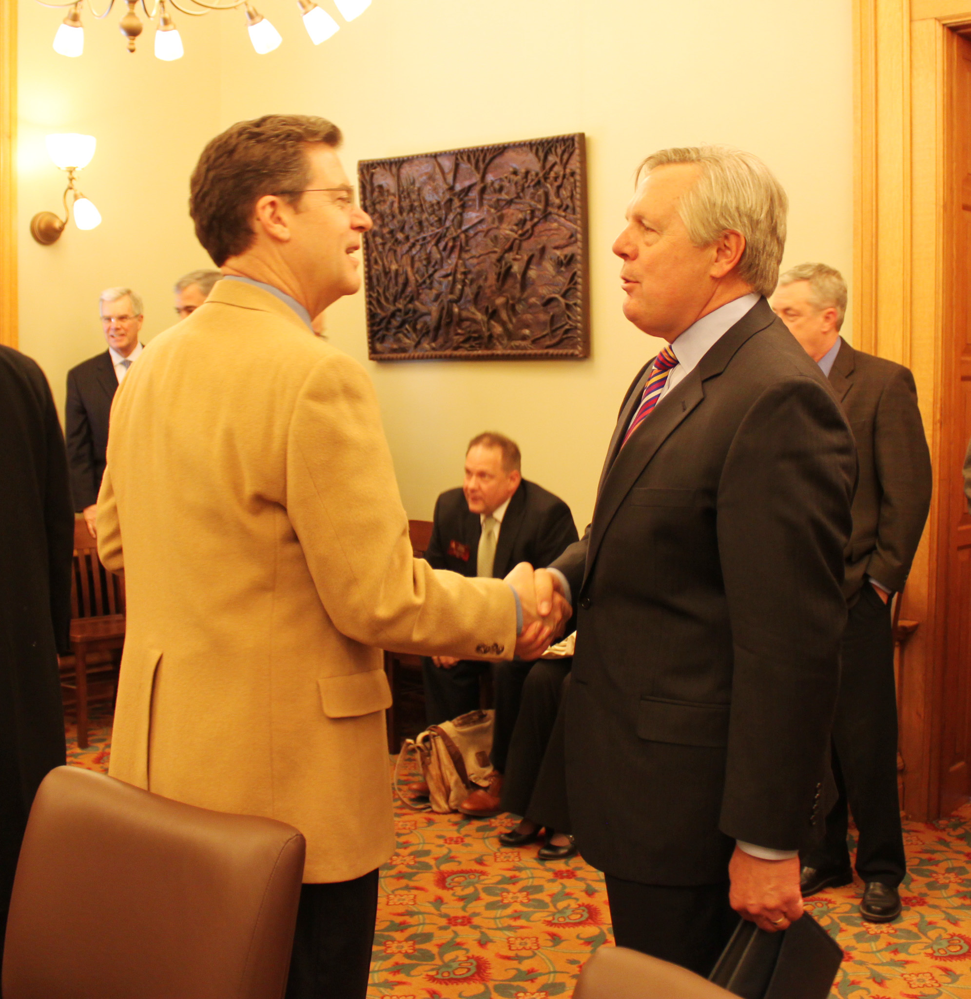 Pictured above: Kansas Governor Sam Brownback (left) greets Jon Rosell (right), executive director of the Medical Society of Sedgwick County, at the 2013 Topeka Legislative Reception.