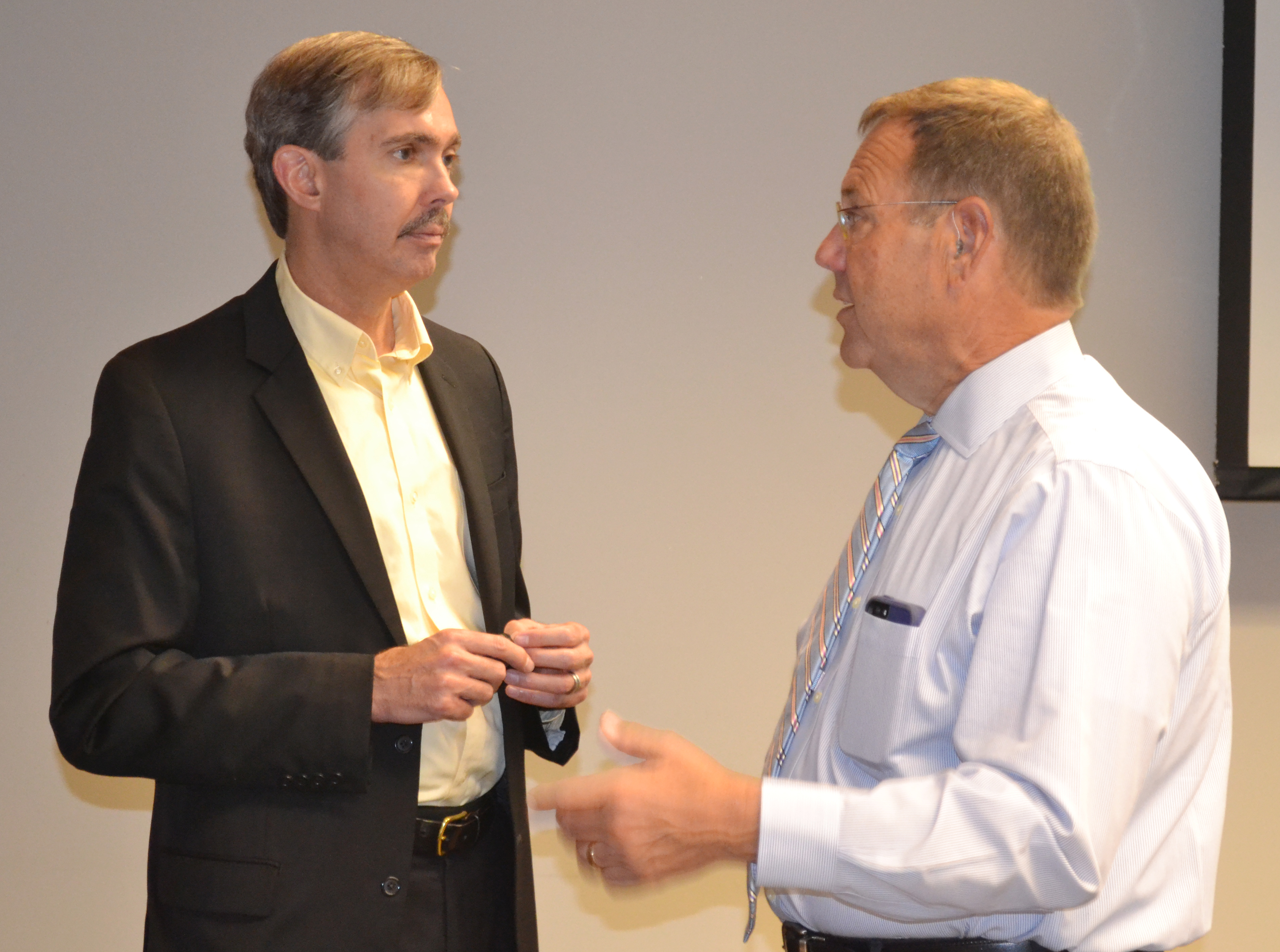 City Manager Bob Layton and Harvey Sorensen of Foulston Siekfin at an information session about the proposed sales tax held at the Chamber last month.