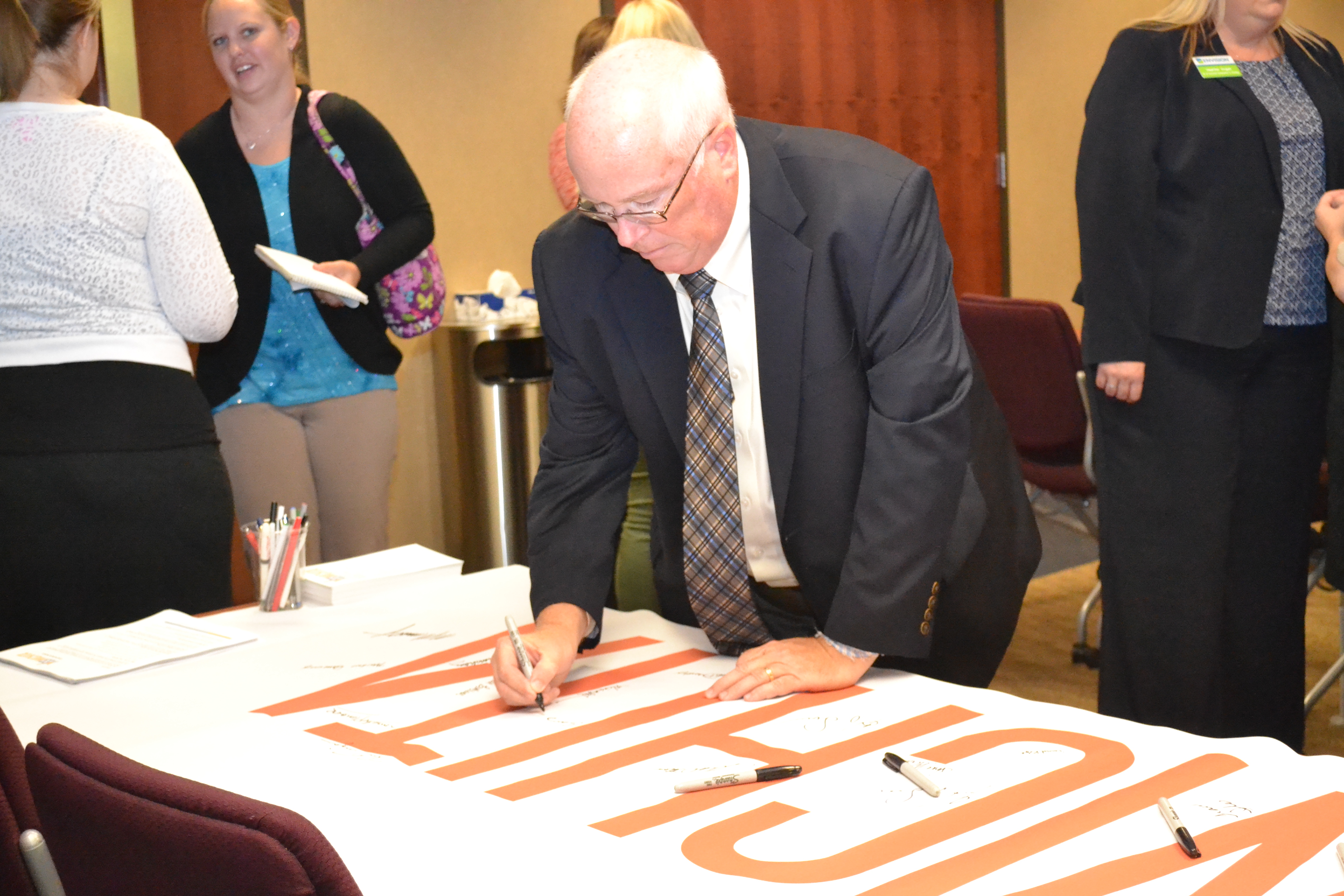 Chamber President & CEO Gary Plummer signs a banner at a news conference launching the Yes Wichita campaign. Chamber supports the Yes Wichita campaign